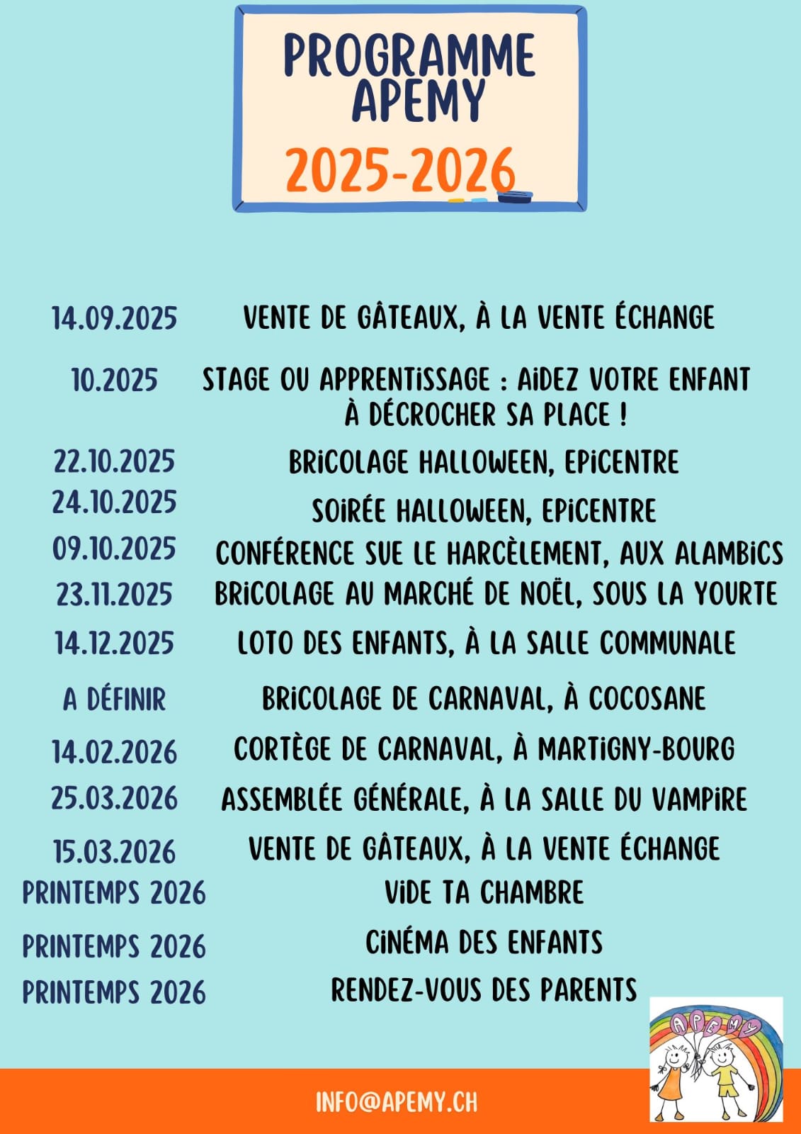 Le but de l'APEMY est de créer un lien entre les parents d’élèves, les enseignants, la direction des écoles et les solutions d'accueil de la petite enfance de la commune de Martigny